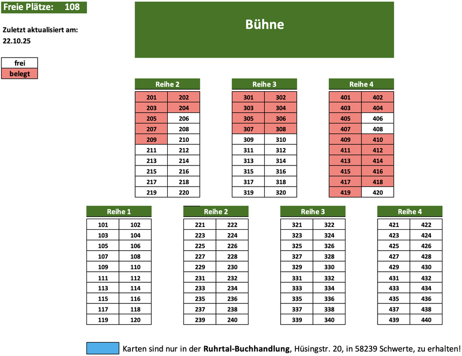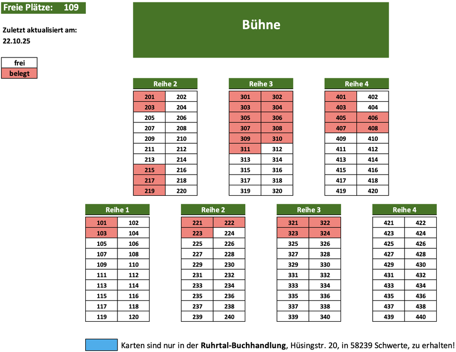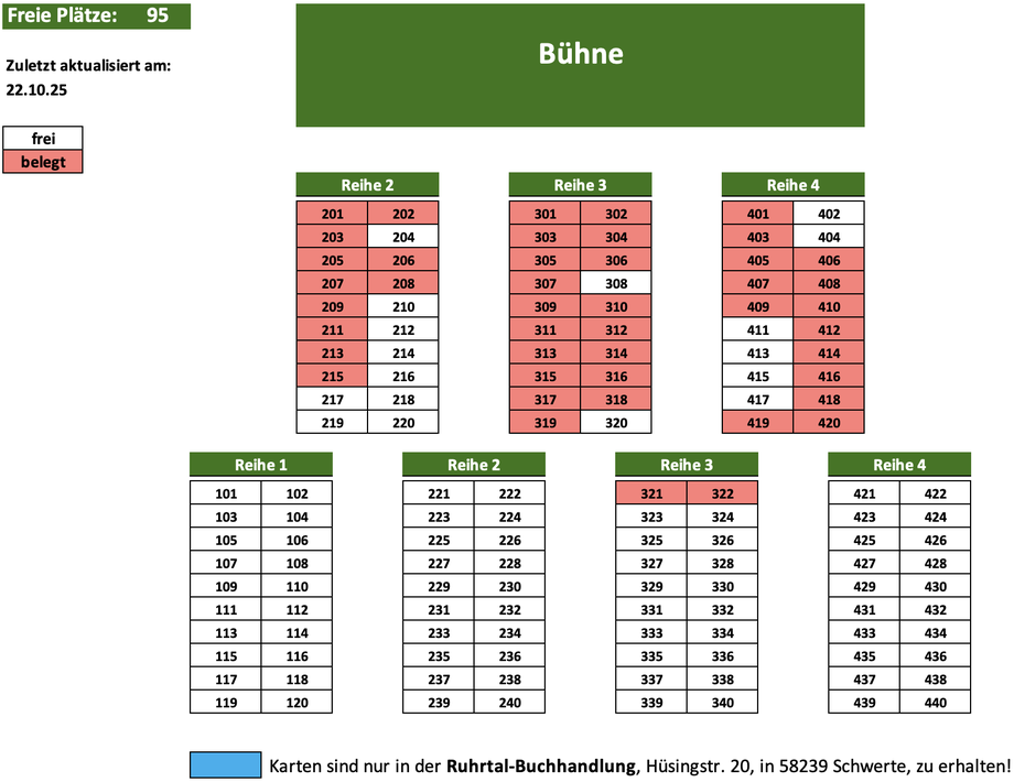 Wir möchten Sie darauf hinweisen, dass die freien Sitzplätze wöchentlich aktualisiert werden. Es kann daher sein, dass die von Ihnen ausgewählten Plätze unter Umständen schon vergeben sind. Wir werden uns aber auf jeden Fall mit Ihnen in Verbindung setzen und Ihnen in diesem Fall alternative Plätze anbieten.